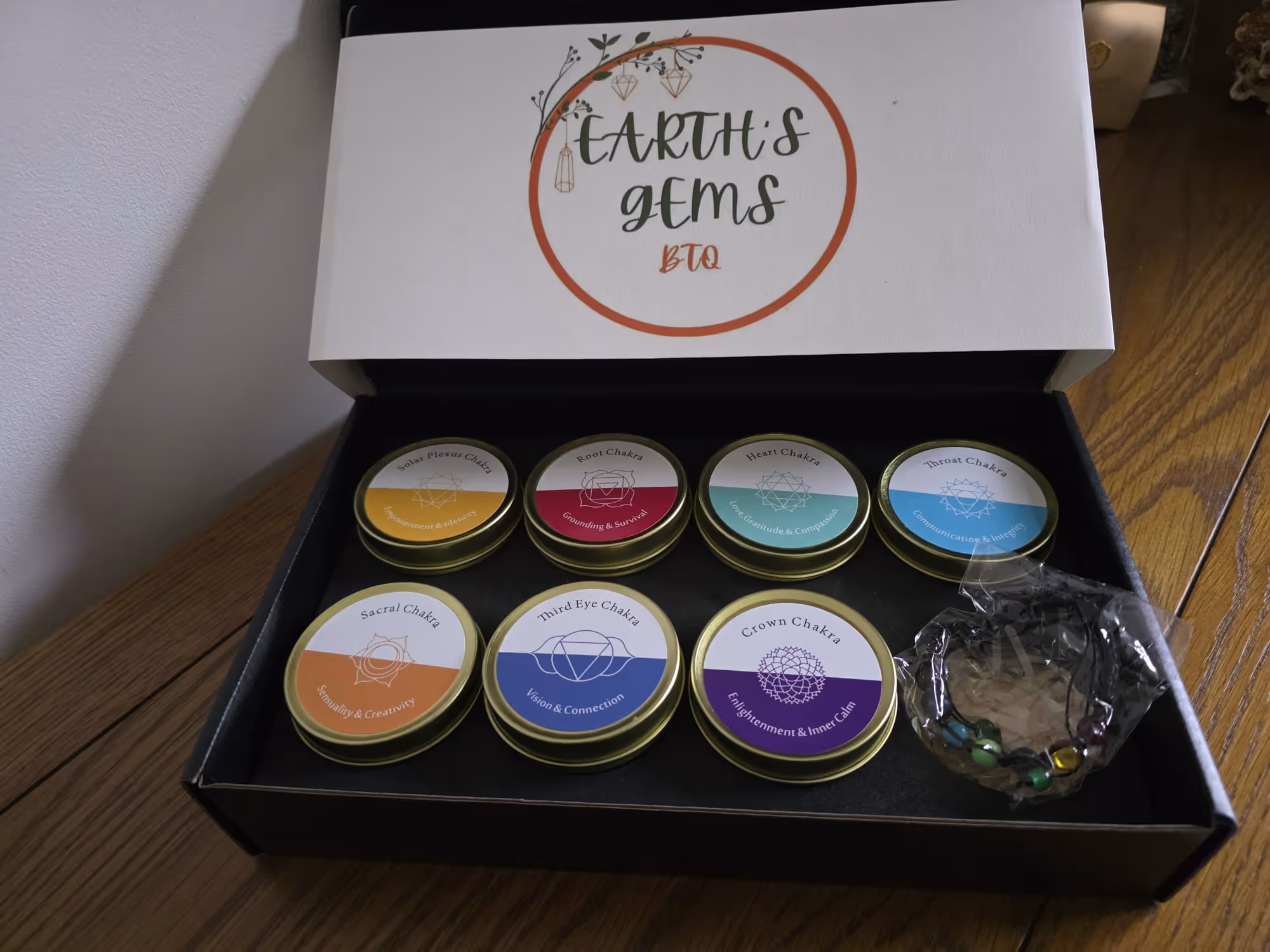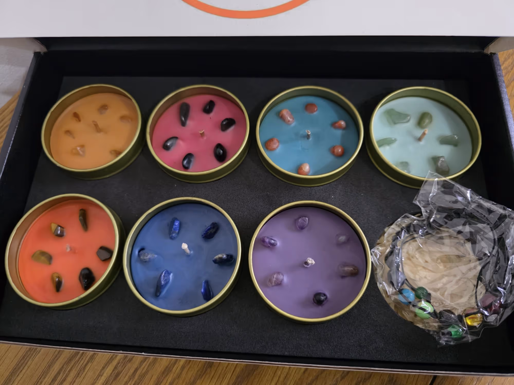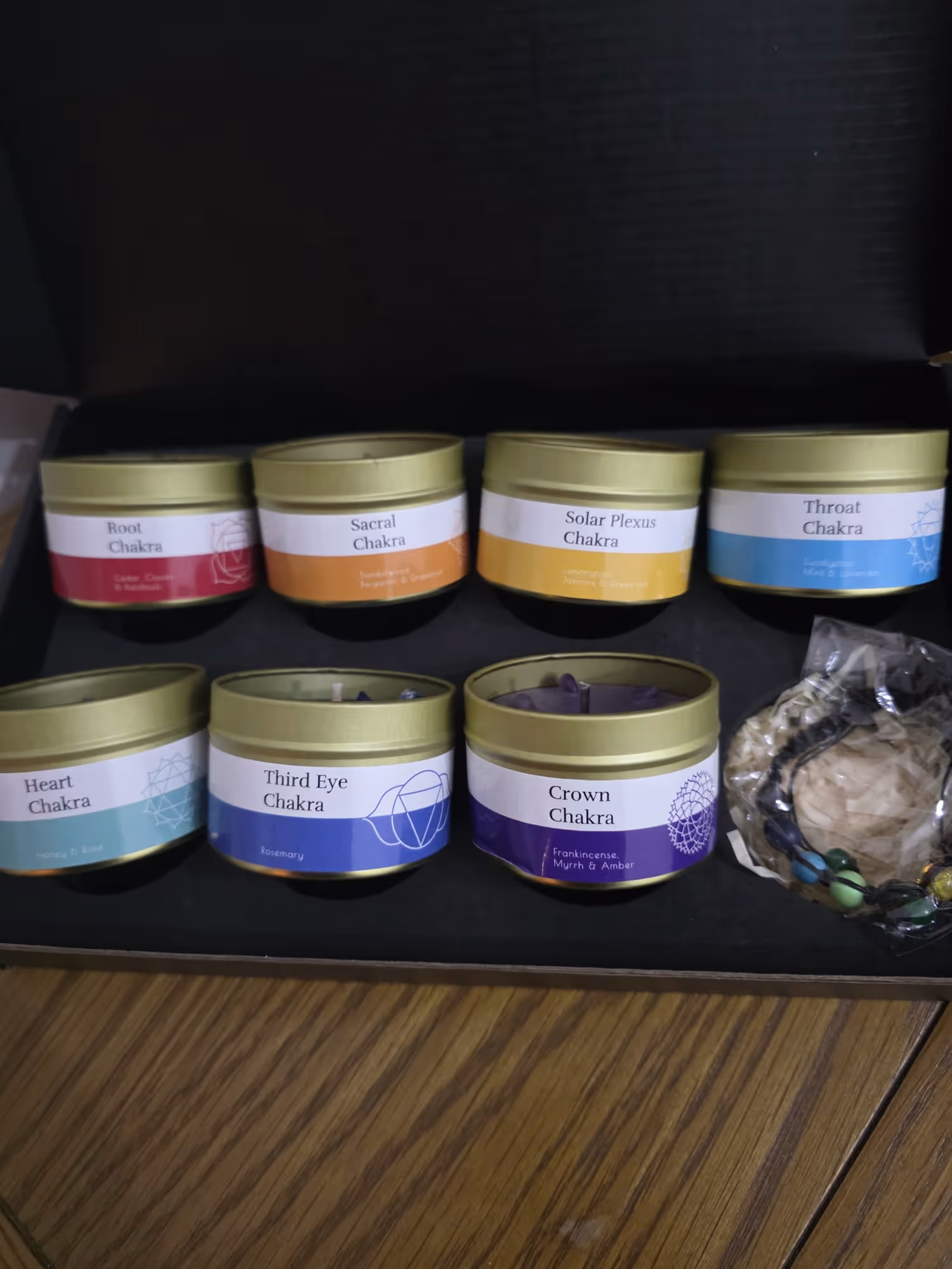 fragrances and finished with real crystal chips, each chosen to align with its chakra’s energy.