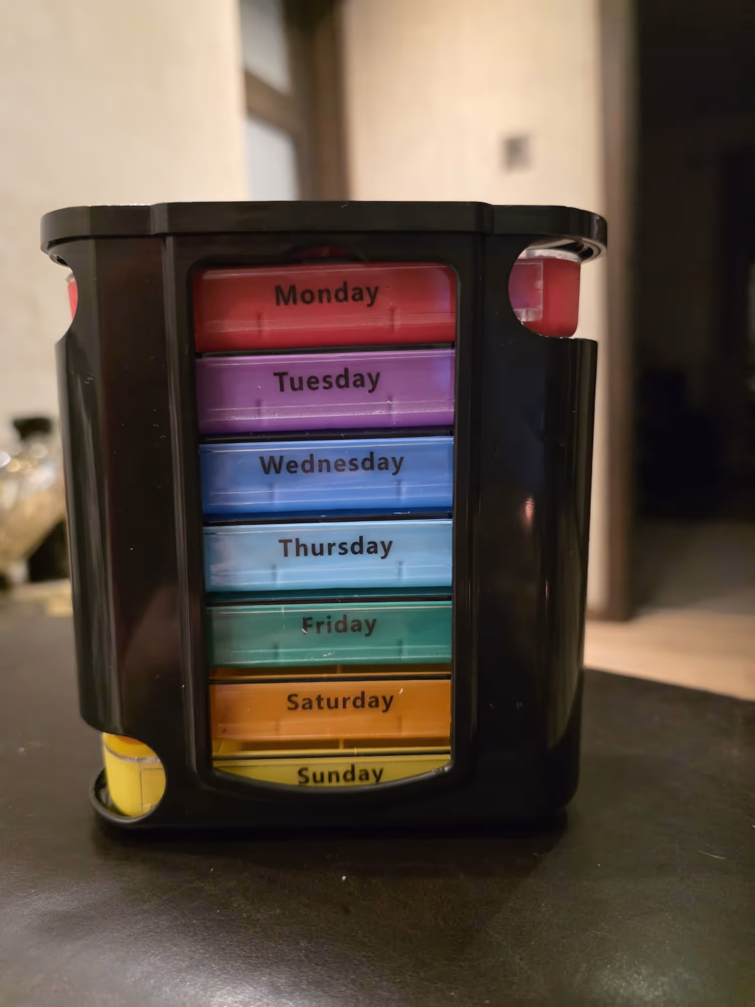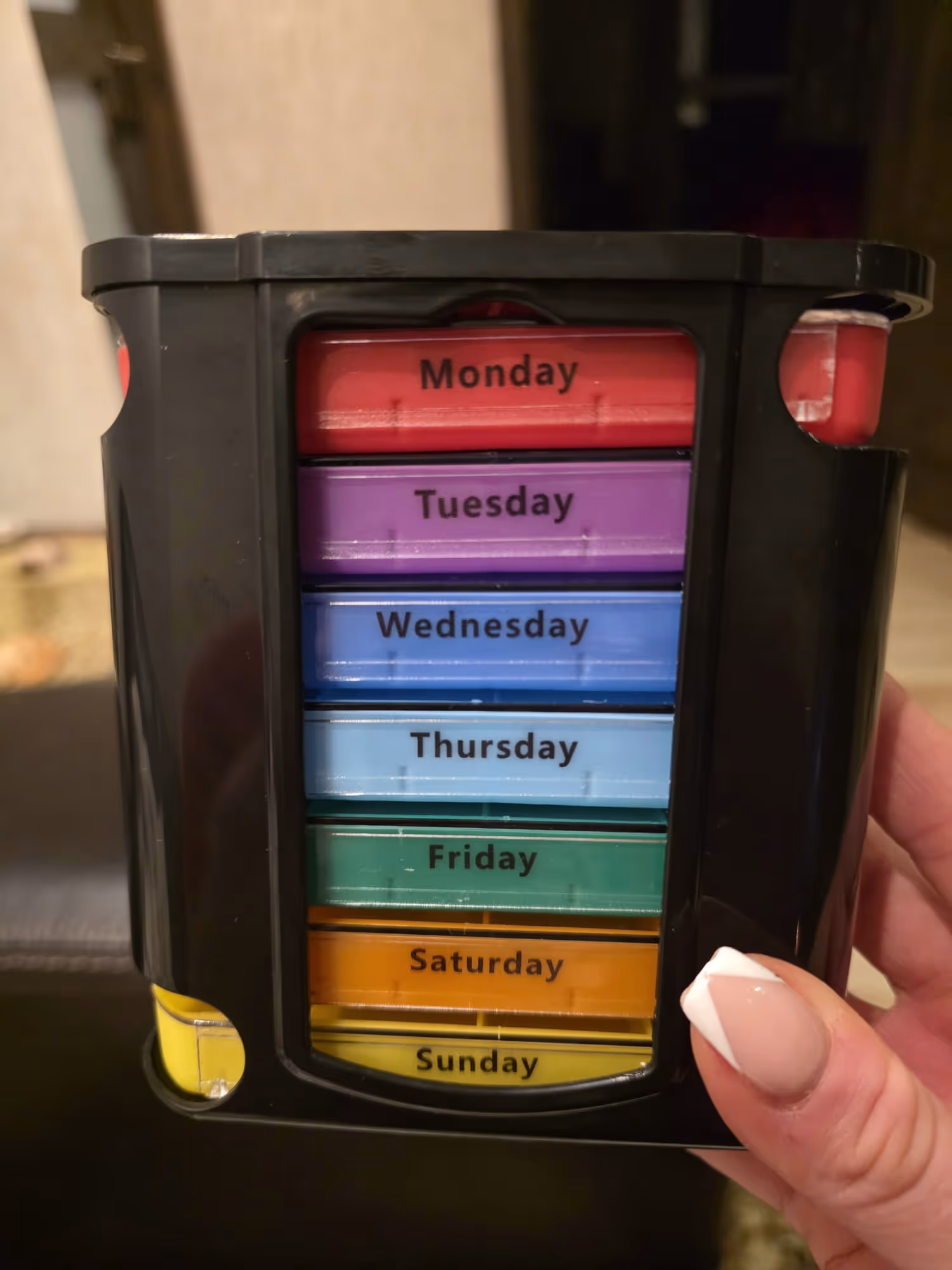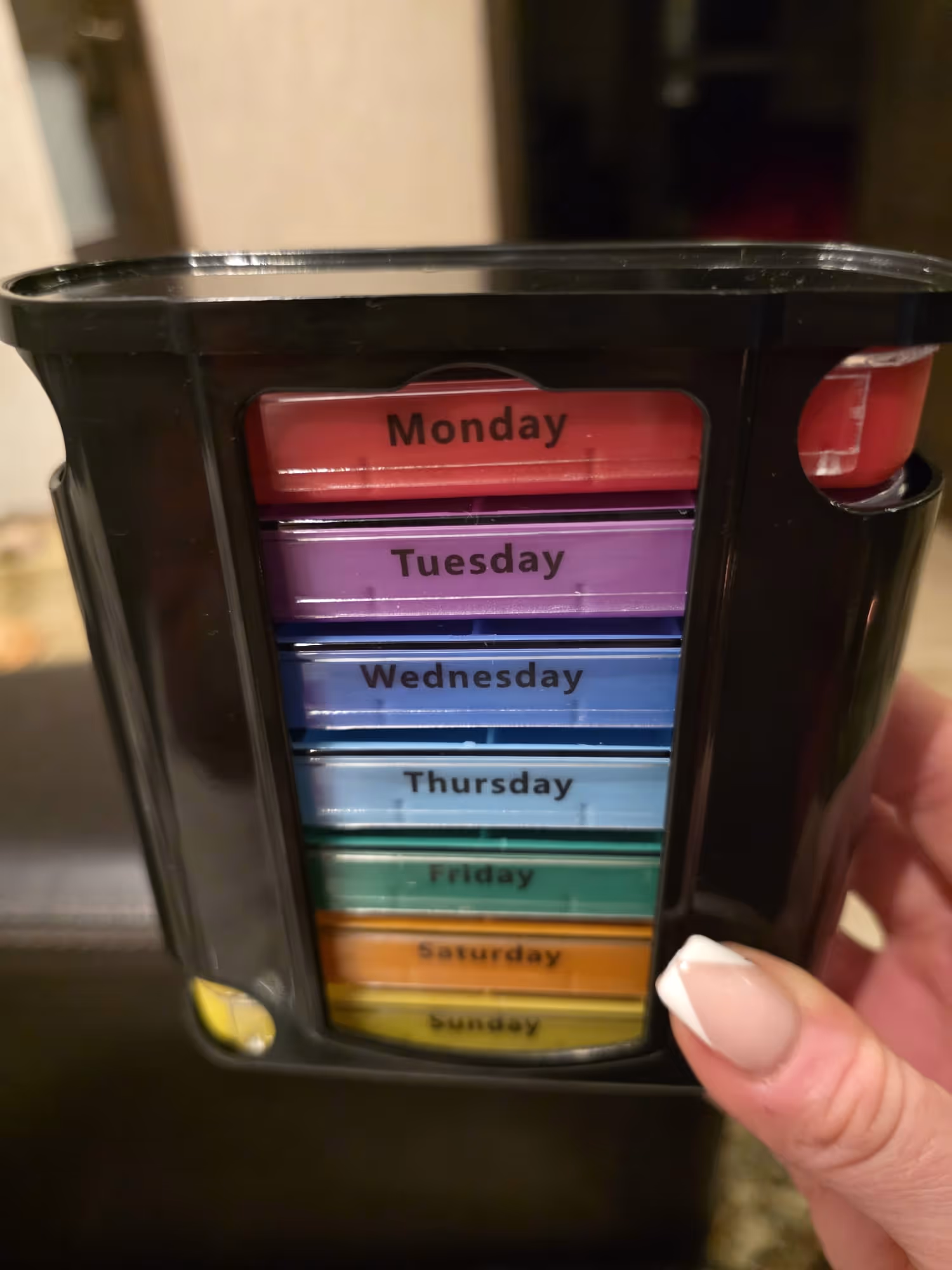 Heading out? Don’t carry the whole week with you. Simply slide out the specific dayโs tray and slip it into your purse or pocket.
