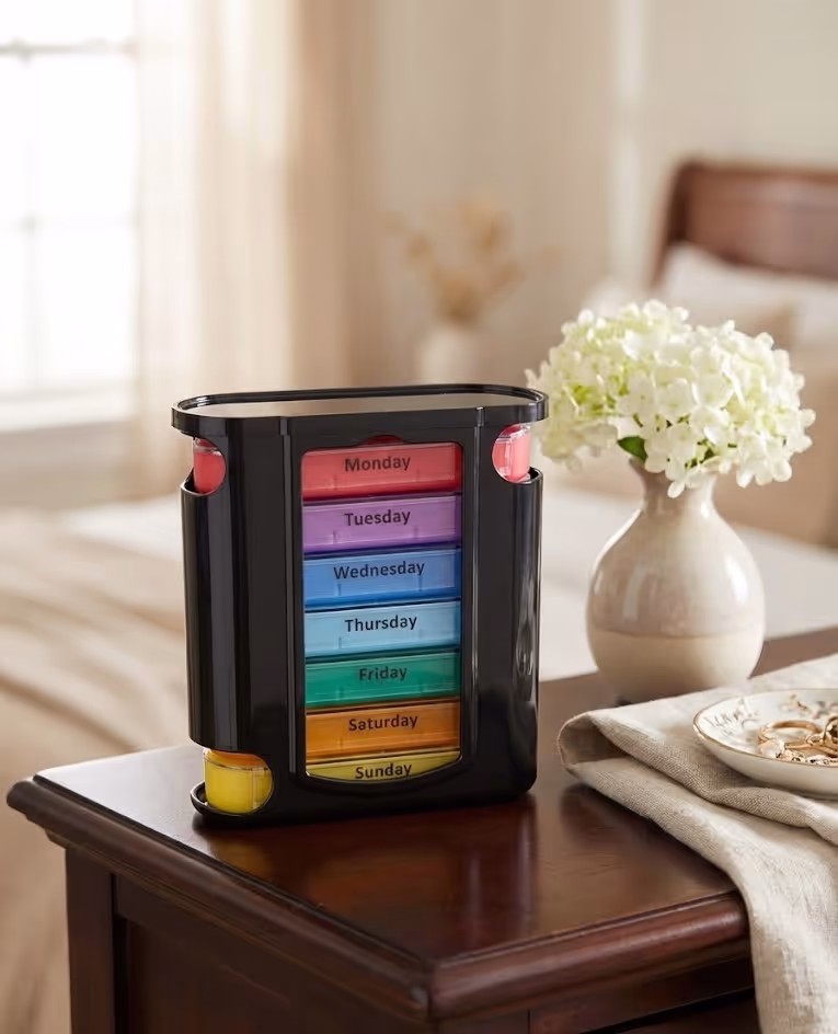 tower featuring seven removable, color-coded trays divided into morning, afternoon, evening, and bedtime compartments.